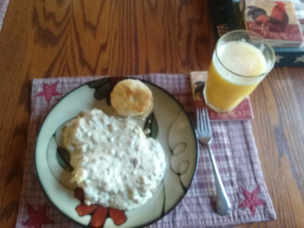 I had saved up some sausage grease and a couple of pieces of sausage. So I made some gravy and baked some frozen biscuits. By 9:40 I was in the middle of ramming sausage gravy and biscuits into my face and the excellent half rolls in. She complains that she shouldn’t be eating breakfast as she breaks a biscuit in half and smothers it in high calorie gravy. Watch the pepper I said. I got a little happy with the black and red pepper. As she’s hammering that first bite home she said that she never puts pepper on anything I cook. She’s smart that way. Like any good southern cook knows, if the food doesn’t burn at both ends, it ain’t got enough pepper.