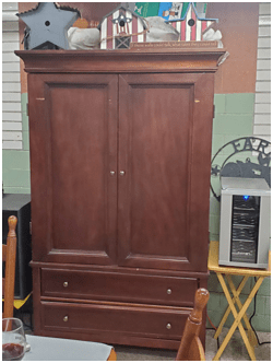 Then a few months ago, my Excellent Half saw a free armoire on Facebook. Just come get it they said. When someone offers you a piece of furniture 6 and a half feet tall, 3 feet wide and 2 feet deep for free, buyer beware. When we got there, a 15 minute drive, the armoire looked just like the picture. It actually looked very nice. Yeah it had a couple of bad spots, but the price was right. We started to move it, and I suspect the only things holding it together were spit, bobby pins, and the prayer of the people giving it away. They were praying that the thing wouldn’t fall apart before it got on the truck. We got it home with no damage except the drawers fell apart. (I guess the spit dried up and the prayers wore off.) I put the drawers back together and used some real screws to make that happen. The piece was also racked a bit. So being the gentleman I am, I exposed the rack and handled it gently. All set up – we use it as a bar. It doesn’t have any alcohol in it. I don’t drink and she only drinks wine. So this bar comes in really handy.